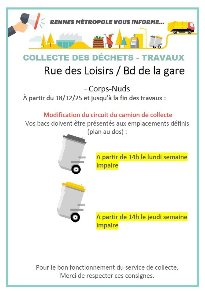 Rennes Métropole vous informe qu'en raison des travaux, la collecte ne peut être faite correctement au carrefour Loisirs/Gare.
