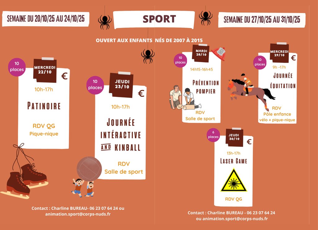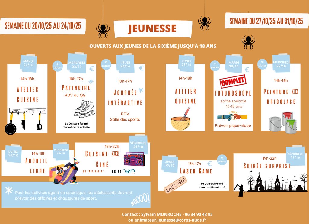 Du 20 au 31 octobre, il y a des animations pour les plus jeunes, à l'ALSH avec tous les animateurs, pour les adolescents de la sixième à 18 ans au QG avec Sylvain, et en sport, avec Charline pour les 10-18 ans !